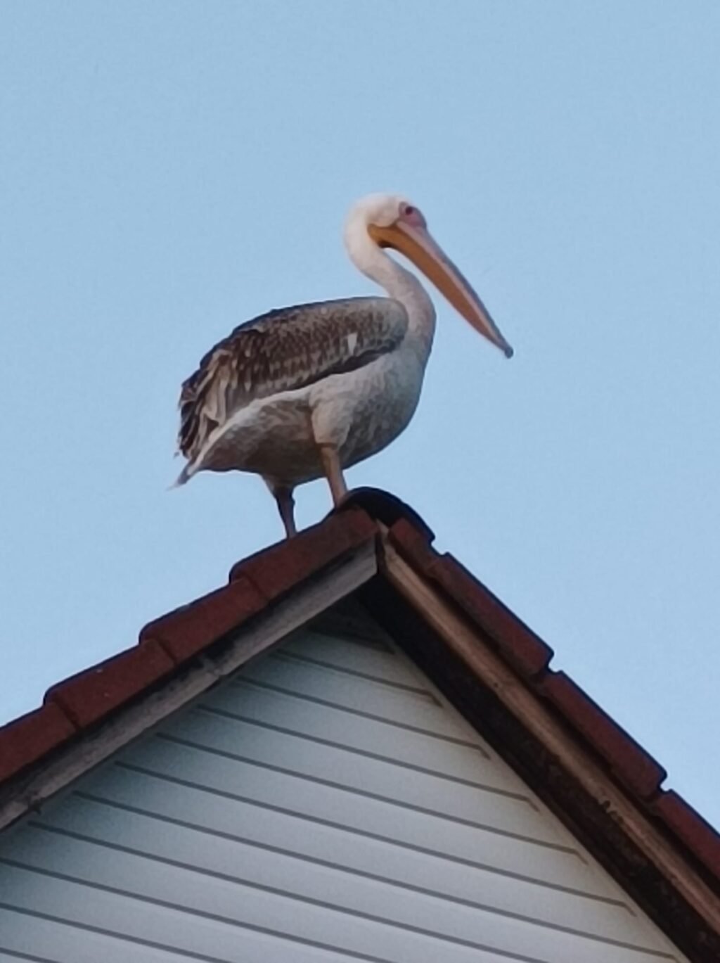 Elképesztő látvány amint egy pelikán látunk a ház tetején ülni.