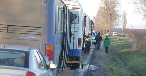 Az Útinform tájékoztatása szerint az 5707-es számú, Villány–Újpetre összekötő úton, Villány belterületén, az 1-es kilométerszelvénynél két autóbusz egymás mellett elakadt az úttesten. A járművek mellett egy munkagép haladt el, amely a rendkívül csúszós útfelületen lassú haladás közben megcsúszott, és nekiütközött az egyik álló busznak.
