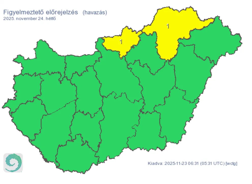 Mielőtt a melegebb, nedves levegő megérkezik, hétfő hajnalban még erős fagy várható. A kevésbé felhős, szélvédett tájakon – főként a Bakony völgyeiben, az Északi-középhegységben és a Duna–Tisza köze déli részén – akár -10 °C is lehet, máshol -1 és -6 °C közötti minimumokra kell készülni.